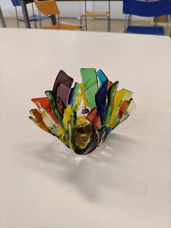 Tijdens de workshop waxinelicht maken ga je je eigen lichthouder maken van gekleurd glas. Je zoekt kleuren en vormen en legt ze in compositie. Hou je van blauwtinten, geel of groen? Je kiest het allemaal zelf. Het oppervlak is ongeveer 20 cm vierkant. Je kunt ook poeders en frtten gebruiken.