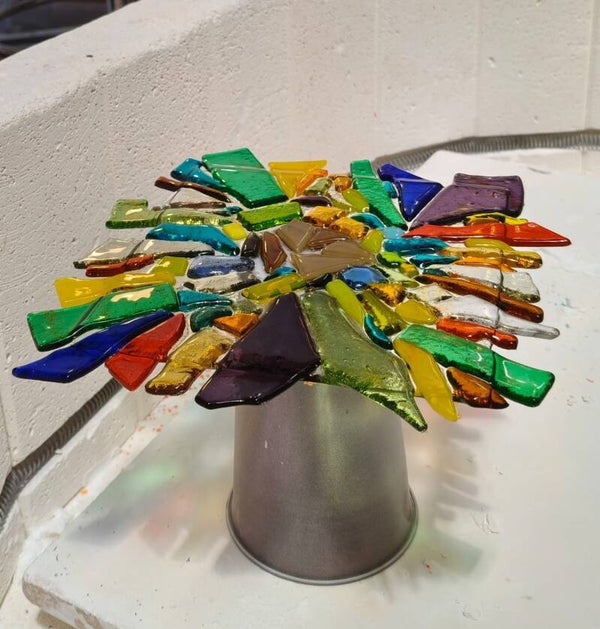 Na de workshop gaat het glaswerk twee keer de glasoven in, een keer om samen te smelten en daarna een keer om de vorm van het waxinelicht erin te maken.